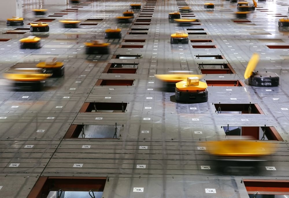 ↑2017年5月3日,在義烏申通公司,機器人運載包裹進行分揀。