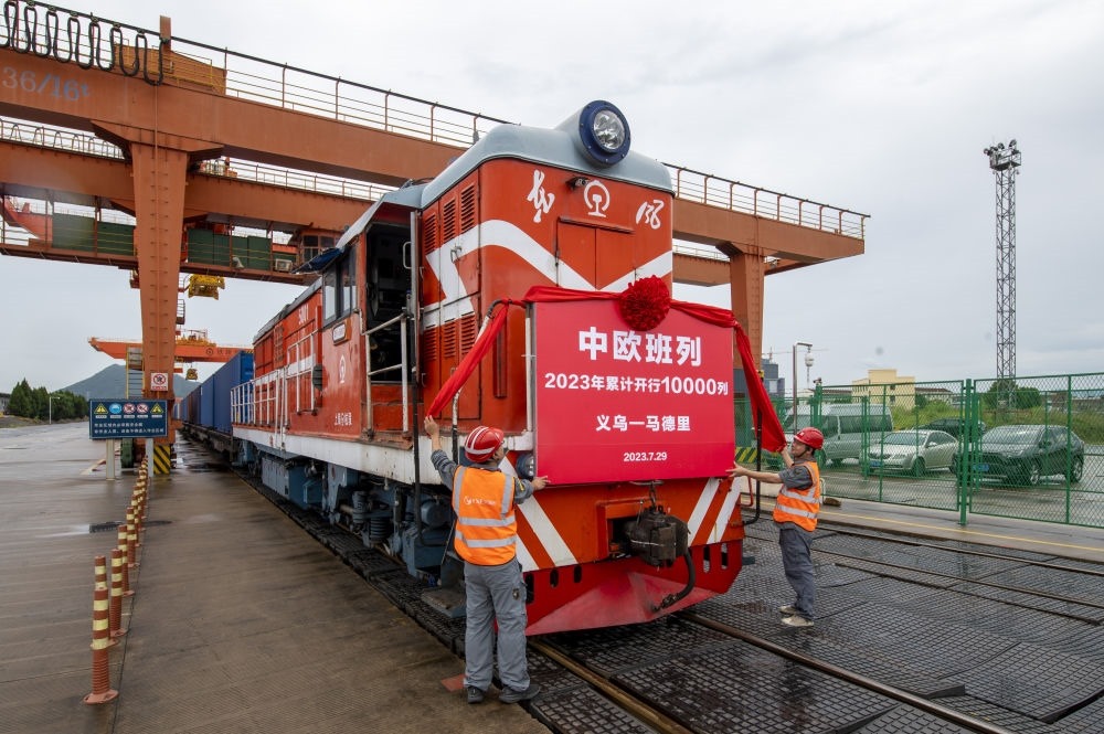 ↑2023年7月29日,滿載110個標箱出口貨物的X8020次中歐班列從鐵路義烏西站準備啟程。