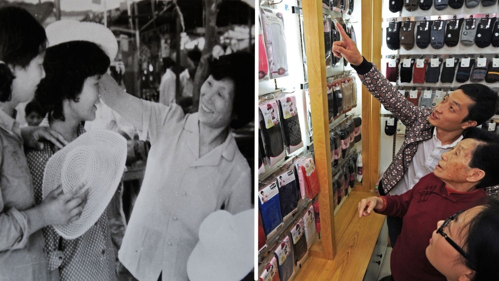 ↑拼版照片,左圖為:義烏小商品市場第一代經(jīng)營戶馮愛倩(右)在向顧客推銷遮陽帽(攝于上個世紀80年代);右圖為:2018年10月25日,78歲的馮愛倩(中)在傾聽她的孫子、義烏國際商貿(mào)城經(jīng)營戶楊帆(上)介紹他自產(chǎn)自銷的新款襪子。楊帆大學(xué)畢業(yè)后當上了父親創(chuàng)辦的襪業(yè)公司的總經(jīng)理。