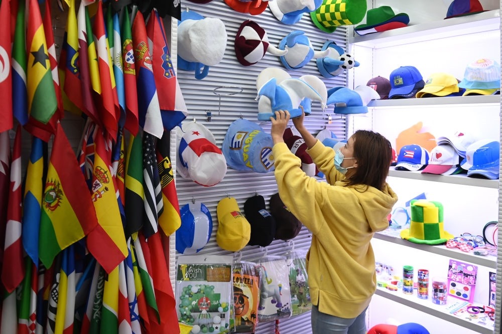 ↑2022年11月17日在義烏國際商貿(mào)城,一家獲得官方授權(quán)的商戶在展示2022卡塔爾世界杯參賽國家旗幟與周邊產(chǎn)品。