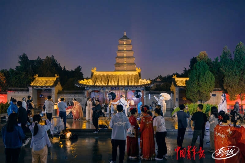 在西安大唐不夜城景區(qū),身著華服的年輕人以大雁塔為背景,拍攝照片。中青在線(xiàn)記者 白楊/攝