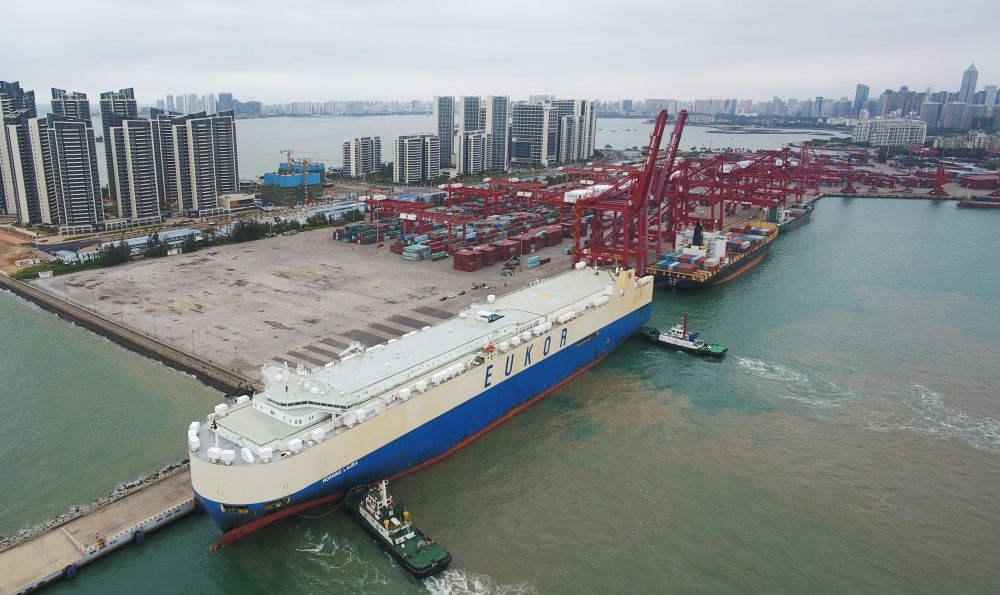 2020年2月16日,滾裝貨船“勞拉”輪駛入??谛阌⒏郏o人機照片)。這是海南自貿區(qū)政策實施后的首艘汽車外貿船。新華社記者 楊冠宇 攝
