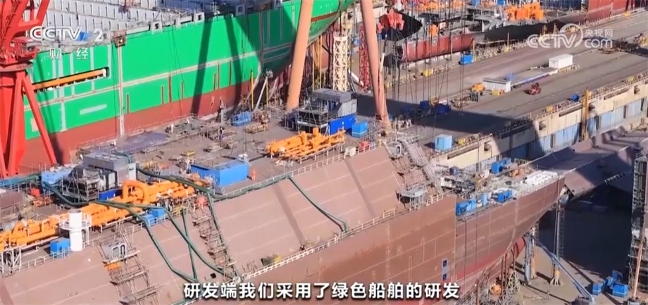 總臺央視記者 孟湛東:我現(xiàn)在是在中國船舶滬東中華造船廠的一艘13000箱的雙燃料集裝箱船上。這艘船除了使用傳統(tǒng)的石油燃料之外,還引入了液化天然氣,可以直接降低28%以上的溫室氣體排放。除此之外,在船頭還有一個獨特的設(shè)計,各位可以看到一個綠色的防風罩,工人們親切地稱它“綠頭怪”,這樣的設(shè)計可以讓船舶在正常行駛當中降低2%左右的燃料消耗。