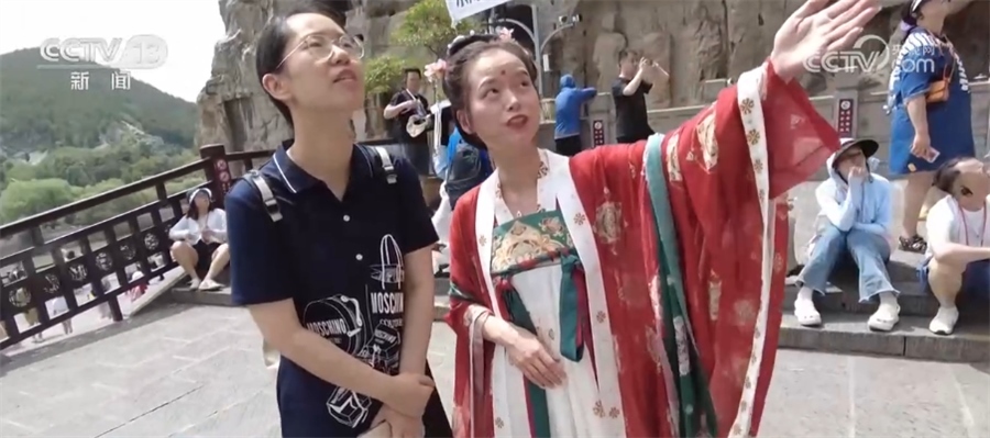?????? 記者 徐倩:在龍門石窟,我發(fā)現(xiàn)一個(gè)很特別的點(diǎn),往年來(lái)這里,都是導(dǎo)游來(lái)陪大家一起逛龍門石窟、來(lái)講解。今年的導(dǎo)游做了一個(gè)服務(wù)升級(jí),會(huì)穿著這種比較有特色的唐裝。