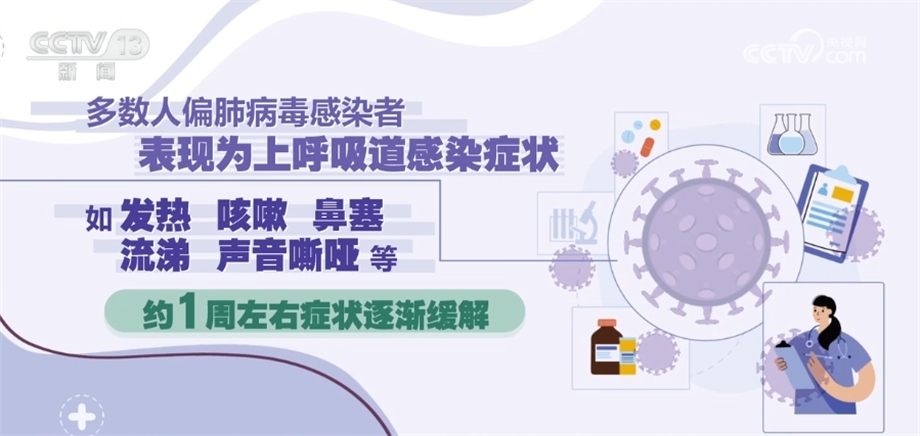 《人偏肺病毒感染診療方案(2023年版)》指出,人偏肺病毒感染者是主要傳染源。從潛伏期末到急性期都有傳染性。主要通過飛沫和密切接觸傳播,也可以通過接觸被病毒污染的物品間接傳播。人偏肺病毒人群普遍易感,在5歲以下兒童、老年人和免疫功能低下的人群中更為多見,潛伏期為3天—9天,多為3天—6天。多數人偏肺病毒感染者表現為上呼吸道感染癥狀,如發(fā)熱、咳嗽、鼻塞、流涕、聲音嘶啞等,約1周左右癥狀逐漸緩解。鑒于目前尚無證據證明有對人偏肺病毒有效的特異性抗病毒藥物,不建議使用抗病毒藥物進行治療。避免盲目或不恰當使用抗菌藥物,尤其是聯合使用廣譜抗菌藥物。