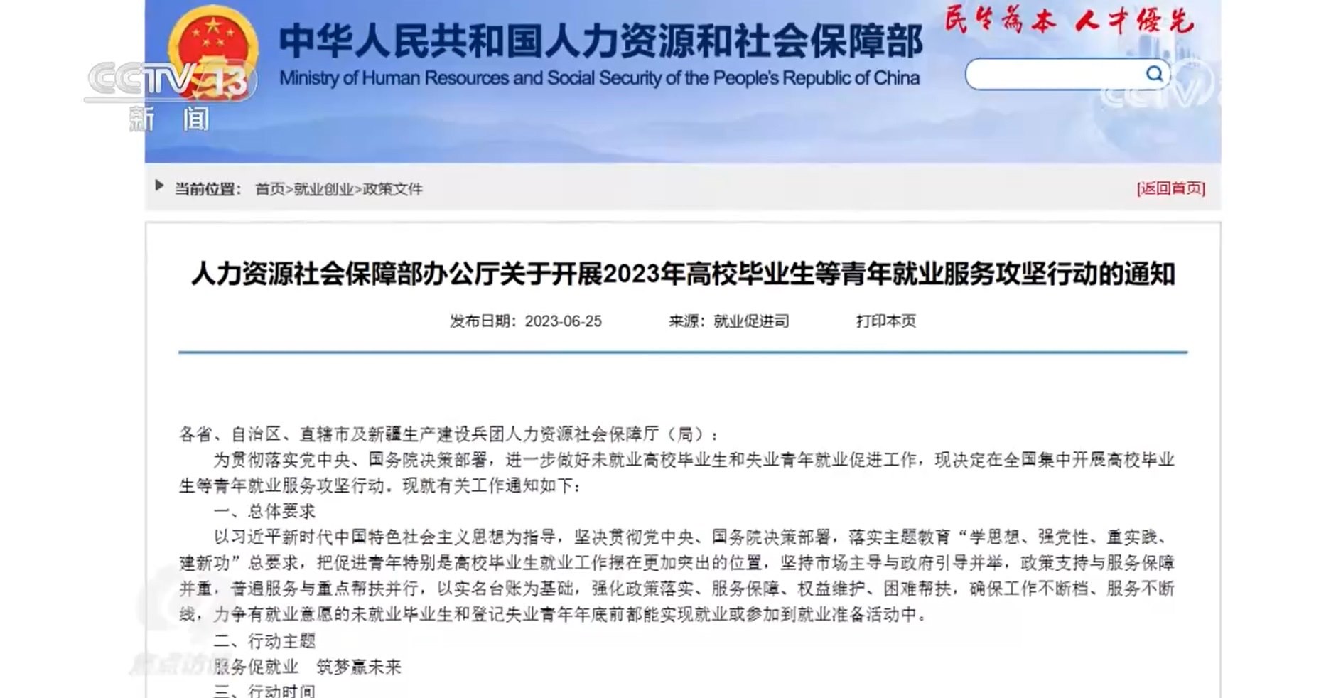 6月25日,人力資源社會(huì)保障部印發(fā)通知,部署啟動(dòng)2023年高校畢業(yè)生等青年就業(yè)服務(wù)攻堅(jiān)行動(dòng),要求省級(jí)人力資源社會(huì)保障部門7月底前,要建立2023屆未就業(yè)畢業(yè)生實(shí)名臺(tái)賬。