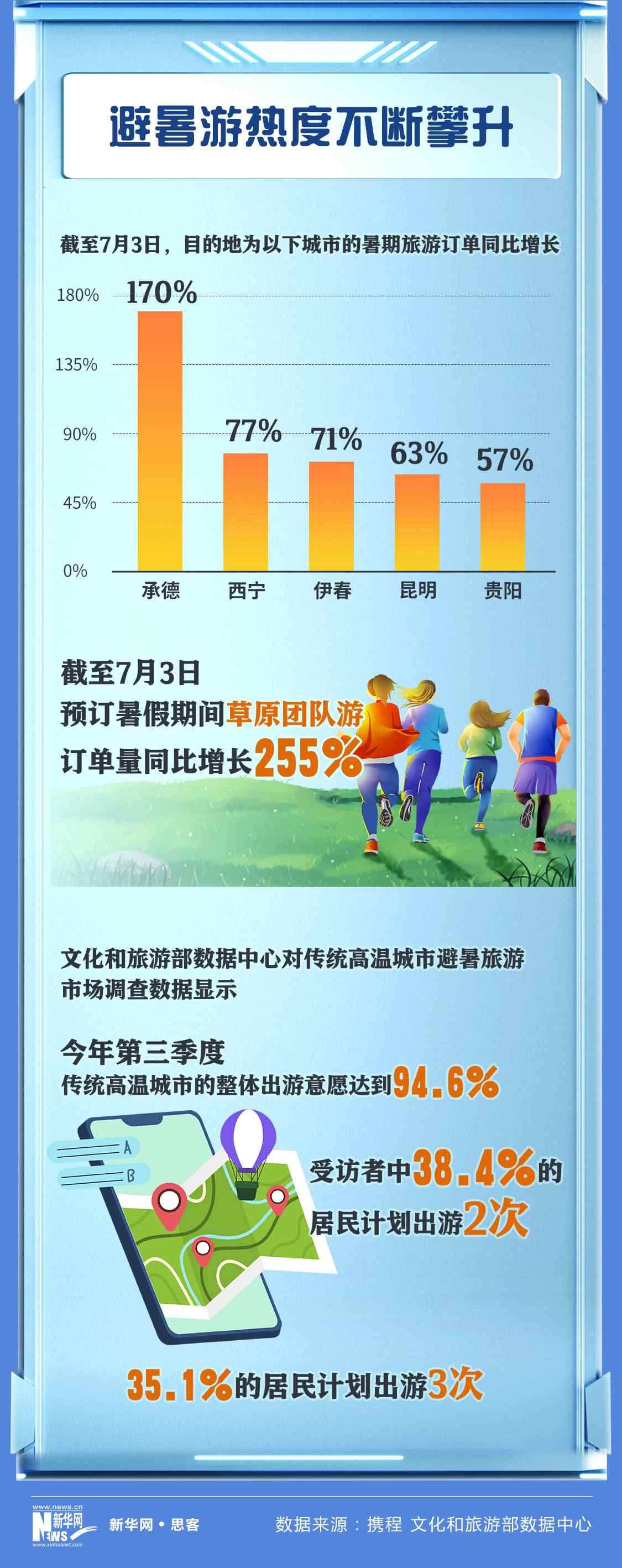 攜程數(shù)據(jù)顯示,截至7月3日,目的地為承德、西寧、伊春、昆明和貴陽的暑期旅游訂單同比分別增長170%、77%、71%、63%和57%。草原游也是廣受歡迎的避暑旅游主題,截至7月3日,預(yù)訂暑假期間草原團(tuán)隊(duì)游的訂單量同比增長255%。