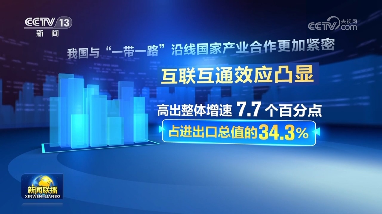 我國與“一帶一路”沿線國家產(chǎn)業(yè)合作更加緊密,互聯(lián)互通效應(yīng)凸顯,進(jìn)出口同比增長9.8%,高出整體增速7.7個(gè)百分點(diǎn),占進(jìn)出口總值的34.3%。