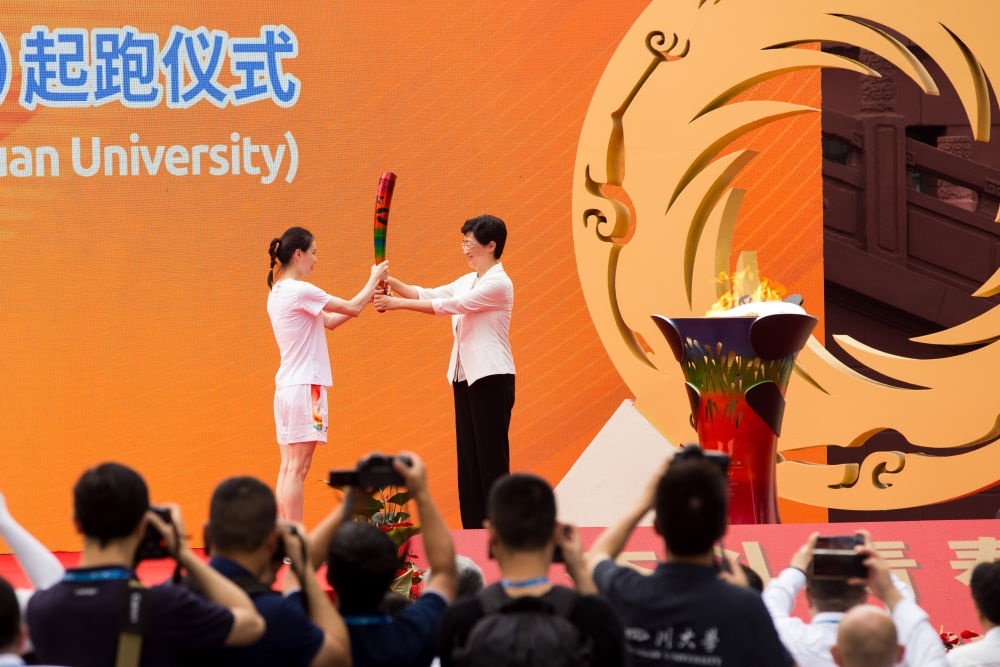7月2日,第一棒火炬手吳敏霞(左)接過(guò)點(diǎn)燃的火炬。當(dāng)日,成都第31屆世界大學(xué)生夏季運(yùn)動(dòng)會(huì)火炬?zhèn)鬟f成都站起跑儀式在四川大學(xué)校園內(nèi)舉行。新華社發(fā)(曹鵬攝)