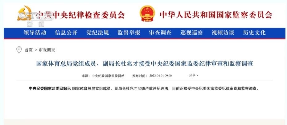 總臺央視記者 宋琎:今年3月27日,二十屆中央首輪巡視對象名單公布?!皩殷w育總局黨組開展機(jī)動巡視”這一消息迅速成為社會熱點(diǎn)。之后不到一周,中央紀(jì)委國家監(jiān)委通報(bào),時任國家體育總局黨組成員、副局長杜兆才接受審查調(diào)查。體育領(lǐng)域反腐成為今年反腐敗工作的一大重點(diǎn)。