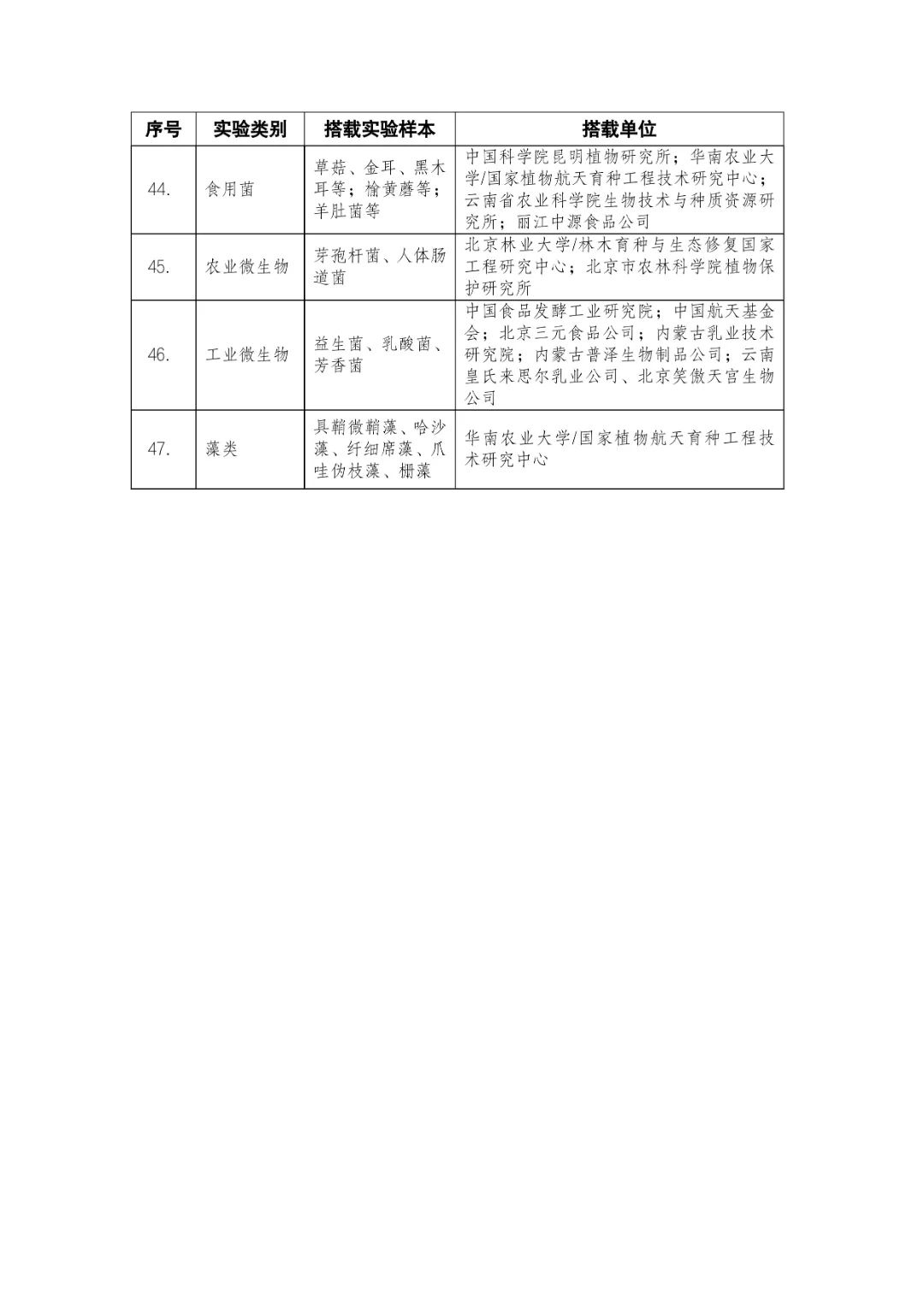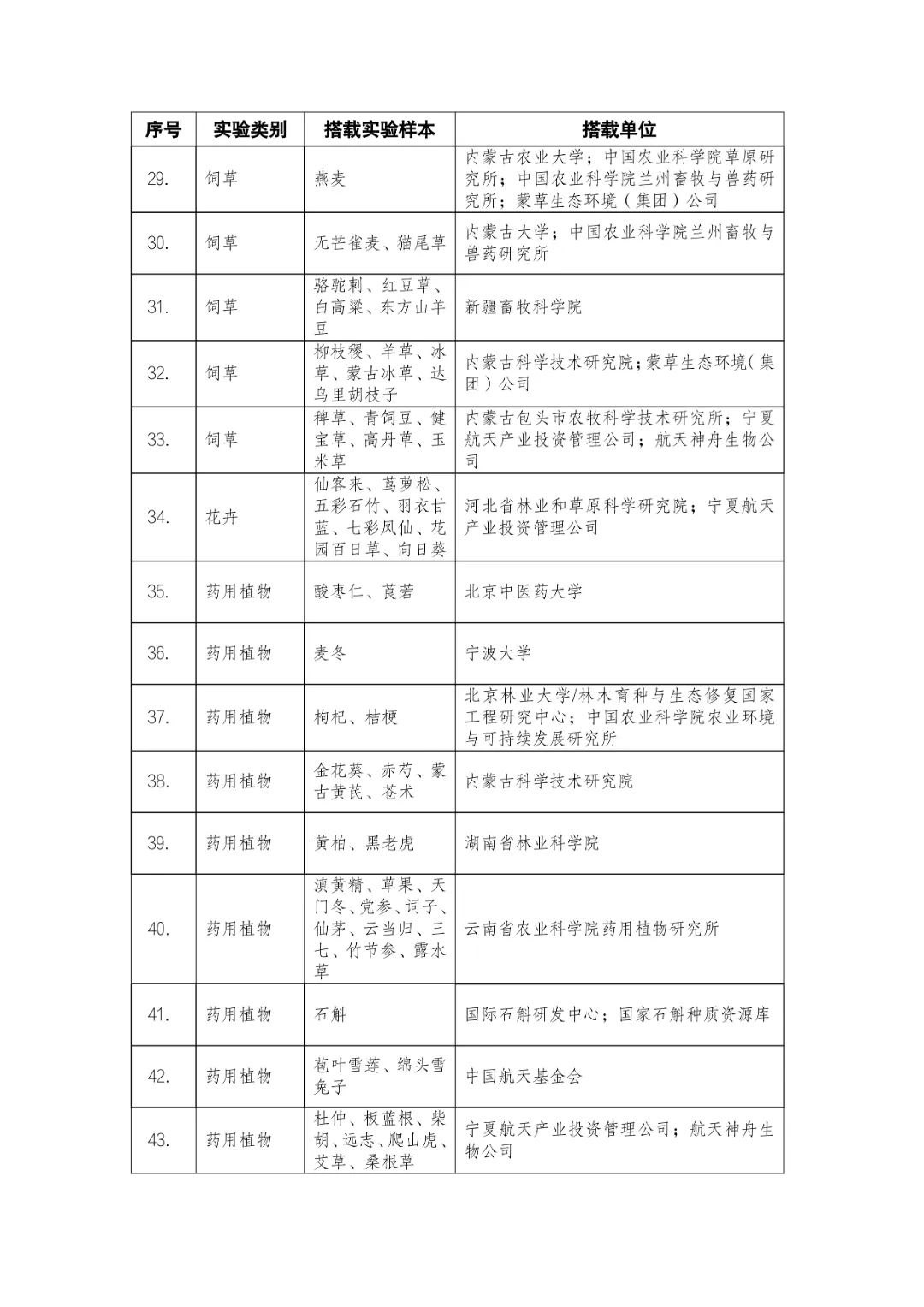 載人航天工程立項(xiàng)實(shí)施以來,始終注重提升工程綜合效益,致力服務(wù)國家經(jīng)濟(jì)社會(huì)發(fā)展。在工程歷次飛行任務(wù)中,均安排了航天育種搭載實(shí)驗(yàn)項(xiàng)目。從神舟十六號(hào)載人飛船開始,中國載人航天工程辦公室向社會(huì)公開征集航天育種搭載實(shí)驗(yàn)項(xiàng)目,于3月23日在工程官網(wǎng)發(fā)布《關(guān)于征集神舟系列載人飛船航天育種實(shí)驗(yàn)項(xiàng)目的機(jī)會(huì)公告》,同時(shí)在工程官網(wǎng)開辟“航天育種搭載實(shí)驗(yàn)”管理平臺(tái),接受搭載需求單位申報(bào)實(shí)驗(yàn)項(xiàng)目。辦公室組織專家對(duì)申報(bào)項(xiàng)目進(jìn)行評(píng)審,遴選出53個(gè)單位的136種份航天育種實(shí)驗(yàn)材料實(shí)施搭載。包括農(nóng)作物47份(糧食作物種子12份、經(jīng)濟(jì)作物種子28份、耐鹽堿植物7份);林草、花卉和藥用植物76份(林木17份、飼草21份、花卉7份、藥用植物31份);微生物和其它13種(農(nóng)業(yè)微生物菌種2種、工業(yè)微生物菌種3種、食用菌3種、藻類和苔蘚5種)(清單附后)。