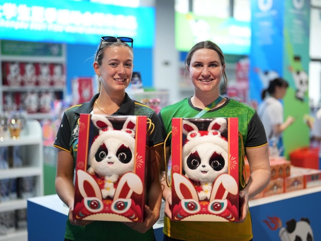 澳大利亞水球隊的露辛達·蘇珊和隊友逛了將近二十分鐘,最終選擇了戴著兔耳朵帽子的兔年版“蓉寶”,因為“覺得這個造型最可愛”,而當大家給她解釋這個造型的來源時她才恍然大悟:“原來今年是中國的兔年?那我就知道為什么是這個造型了!”