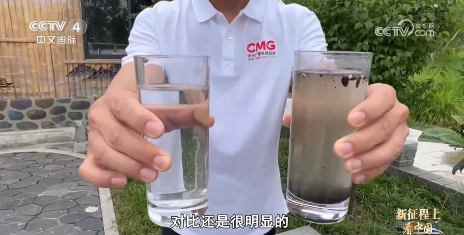 記者:這里是湖水。你看,這兩個(gè)杯子(里的水)處理之前跟處理之后對比還是很明顯的。