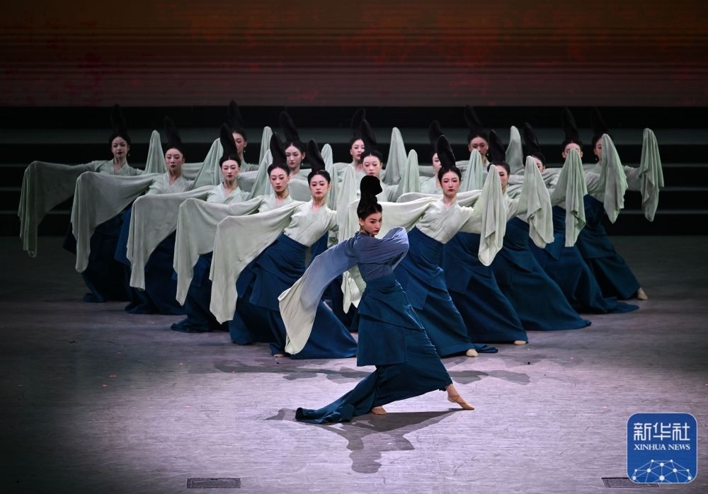 ↑7月29日,演員在聯(lián)歡會(huì)現(xiàn)場(chǎng)表演《只此青綠》。新華社記者 蔡湘鑫 攝