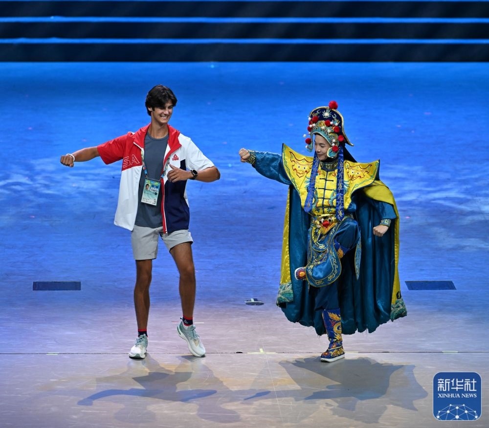 ↑7月29日,美國運(yùn)動(dòng)員杜恩(左)在聯(lián)歡會(huì)現(xiàn)場(chǎng)與川劇演員互動(dòng)。新華社記者 蔡湘鑫 攝