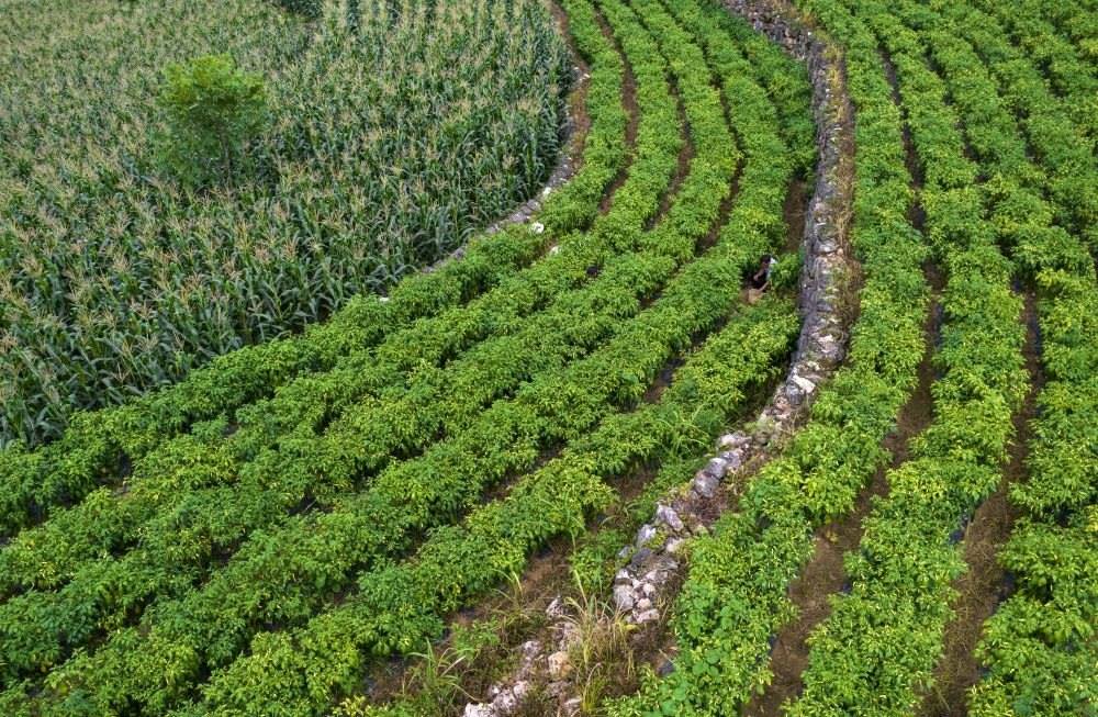 7月27日,一位村民在木者村“摸石谷”中建成的“三保”臺(tái)地上干農(nóng)活。新華社記者 楊植森 攝