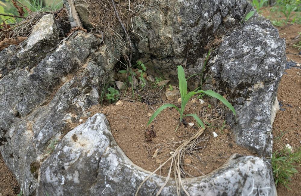 圖為2023年7月27日拍攝的一棵種在石頭凹里的玉米,西疇縣原來的土地大部分都是這樣的。新華社記者 費(fèi)茂華 攝