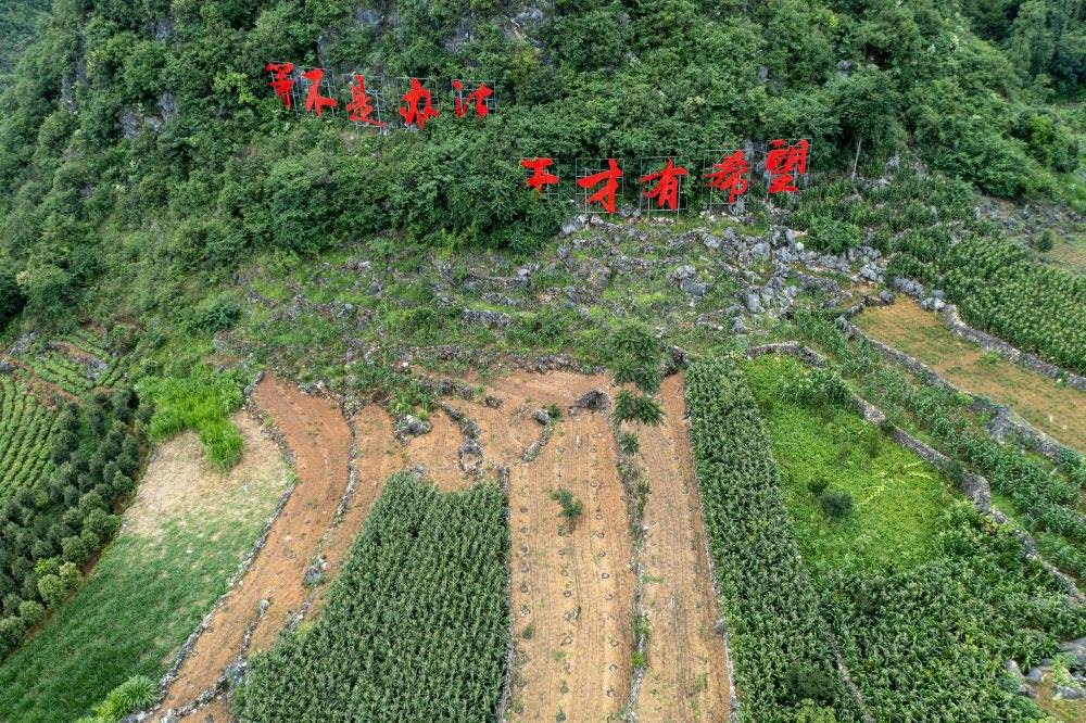 拼版照片:上圖為1991年拍攝的西疇縣大鄔麻村改造前的石漠化情況(西疇縣融媒體中心供圖);下圖為2023年7月26日拍攝的西疇縣大鄔麻村改造后的情況(新華社記者 費(fèi)茂華 攝)。