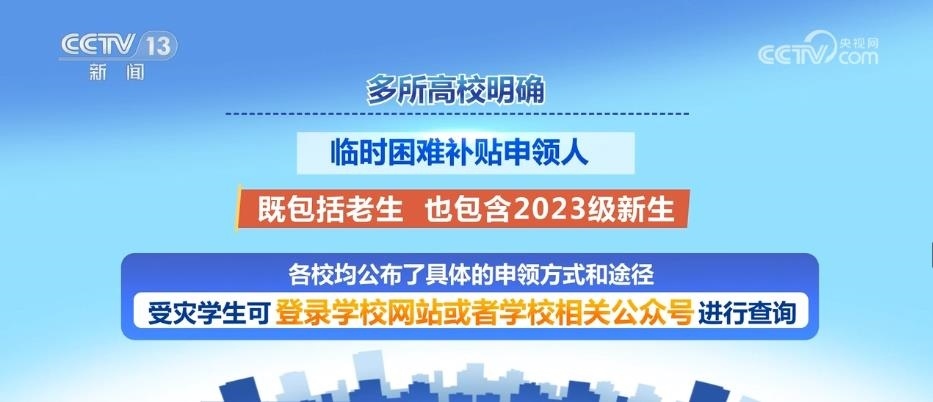 多所高校明確,臨時困難補貼申領(lǐng)人既包括老生,也包含2023級新生。各校均公布了具體的申領(lǐng)方式和途徑,受災(zāi)學(xué)生可登錄學(xué)校網(wǎng)站或者學(xué)校相關(guān)公眾號進(jìn)行查詢。其中,南開大學(xué)、北京航空航天大學(xué)等高校公布了資助熱線。上海交通大學(xué)、西北工業(yè)大學(xué)等高校提出,需要幫助的學(xué)生可第一時間聯(lián)系輔導(dǎo)員。華東師范大學(xué)提出需要幫助的同學(xué)可在學(xué)生資助管理中心網(wǎng)站后臺申請臨時性困難補助。