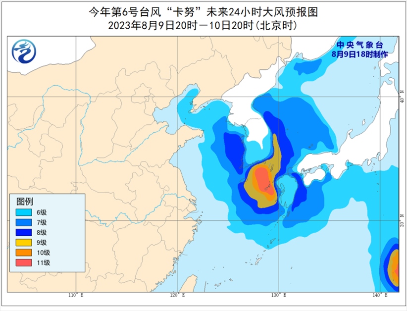 9日20時(shí)至10日20時(shí),渤海東部、渤海海峽、黃海大部海域、東海東部海域?qū)⒂?-7級(jí)、陣風(fēng)8-9級(jí)的大風(fēng),其中黃海中部和南部偏東海域、東海東北部偏東海域風(fēng)力可達(dá)8-9級(jí),“卡努”中心經(jīng)過(guò)的附近海域風(fēng)力可達(dá)10-11級(jí)、陣風(fēng)12-13級(jí);遼東半島沿岸也將有5-6級(jí)大風(fēng),陣風(fēng)可達(dá)7-8級(jí)。