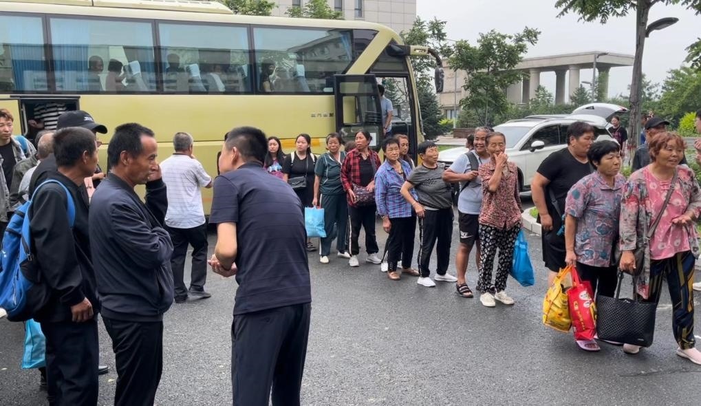 8月4日,轉(zhuǎn)移安置群眾乘大巴車來到五常市雅臣中學安置點。新華社記者 劉昊東 攝