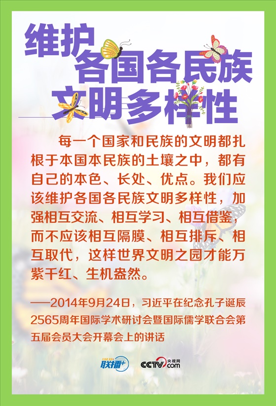 人類文明多樣性賦予這個世界姹紫嫣紅的色彩,多樣帶來交流,交流孕育融合,融合產(chǎn)生進步。長期以來,習(xí)近平主席在不同場合多次倡導(dǎo)尊重世界文明多樣性,推動不同文明交流對話、和平共處、和諧共生。讓我們一起來學(xué)習(xí)。
