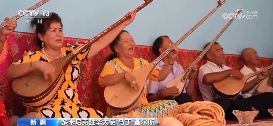 駐華使節(jié)們走進喀什古城的街市巷陌,感受當?shù)鬲毺氐拿褡逦幕辉诳俗螤柷Х鸲?,領略跨越千年的石窟藝術;來到新疆民間手工樂器制作第一村庫車市新和縣加依村,同當?shù)匕傩找黄疠d歌載舞;觀看非遺項目十二木卡姆等一系列活動,讓使節(jié)們感嘆,新疆少數(shù)民族傳統(tǒng)文化和生活習俗得到了充分保護。