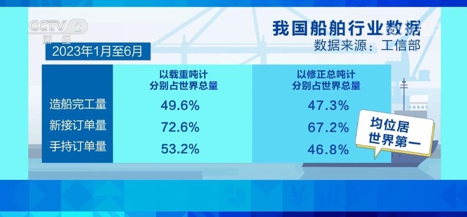 工業(yè)和信息化部數(shù)據(jù)顯示,2023年1月—6月,我國造船完工量、新接訂單量和手持訂單量,以載重噸計分別占世界總量的49.6%、72.6%和53.2%,以修正總噸計分別占47.3%、67.2%和46.8%,均位居世界第一。