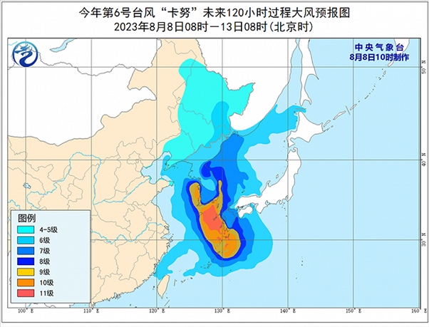 預(yù)計(jì)今年第6號臺風(fēng)“卡努”將以每小時10公里左右的速度向北移動,強(qiáng)度將有所增強(qiáng),8月10日上午將在韓國南部沿海登陸,預(yù)計(jì)登陸時強(qiáng)度為強(qiáng)熱帶風(fēng)暴級或臺風(fēng)級(28~33米/秒,10~12級),11日夜間進(jìn)入我國東北地區(qū)境內(nèi),并逐漸減弱變性為溫帶氣旋。