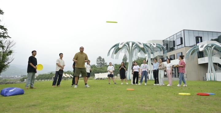 在安吉余村鄉(xiāng)村圖書館前,年輕人在草坪上玩飛盤。圖片來源:新華社