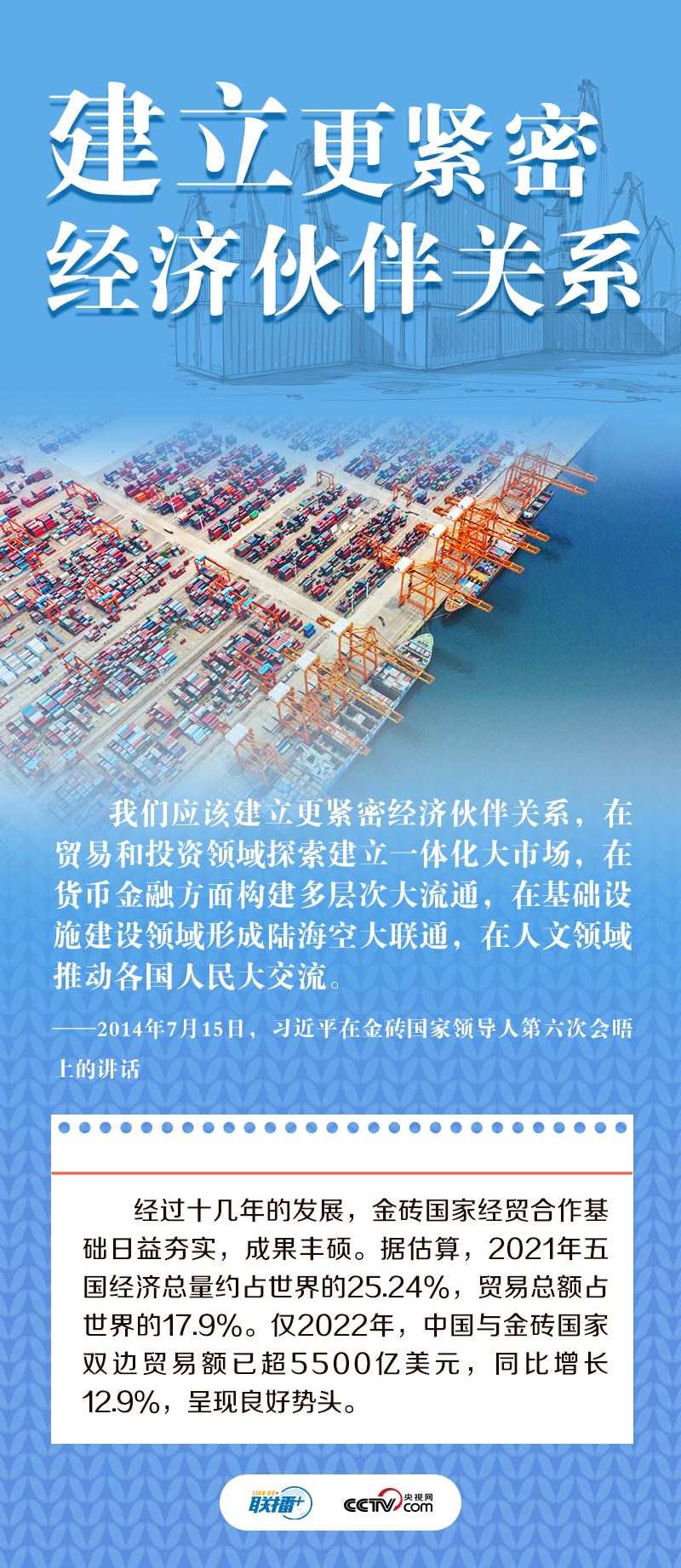 “我們五國雖然山海相隔,但懷著合作共贏的共同目標走到了一起”。“獨木不成林。在經(jīng)濟全球化深入發(fā)展的時代條件下,金磚國家發(fā)展不能獨善其身,必須在謀求本國發(fā)展的同時促進各國共同發(fā)展”。十多年來,習近平主席多次出席或主持金磚國家領導人會晤,論述金磚合作之道,提出“金磚+”合作理念,為推動金磚合作走深走實貢獻中國智慧,在金磚國家合作進程中留下深刻的“中國印記”。