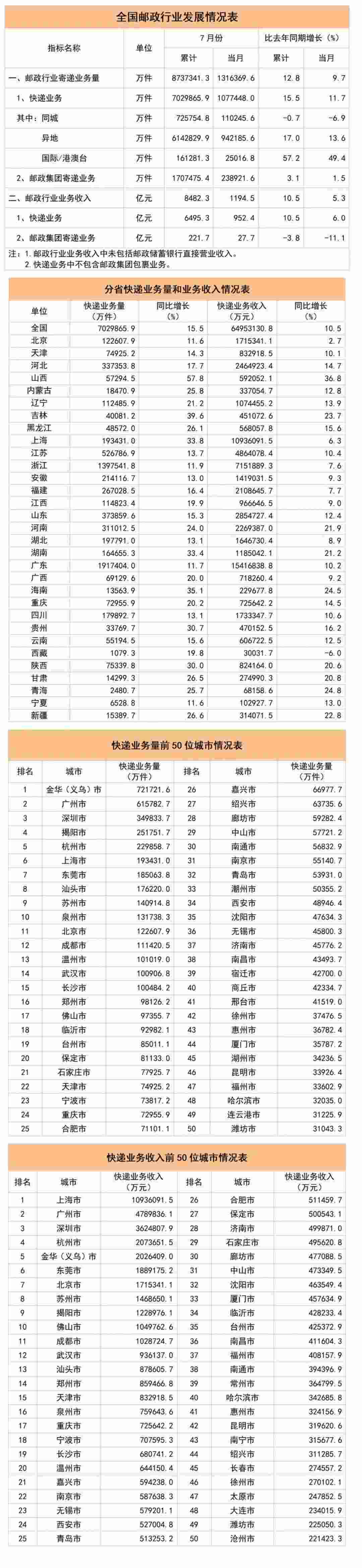 1-7月,郵政行業(yè)業(yè)務收入(不包括郵政儲蓄銀行直接營業(yè)收入)累計完成8482.3億元,同比增長10.5%。其中,快遞業(yè)務收入累計完成6495.3億元,同比增長10.5%。7月份,郵政行業(yè)寄遞業(yè)務量完成131.6億件,同比增長9.7%。其中,快遞業(yè)務量完成107.7億件,同比增長11.7%。7月份,郵政行業(yè)業(yè)務收入完成1194.5億元,同比增長5.3%。其中,快遞業(yè)務收入完成952.4億元,同比增長6.0%。1-7月,同城、異地、國際/港澳臺快遞業(yè)務量分別占全部快遞業(yè)務量的10.3%、87.4%和2.3%;業(yè)務收入分別占全部快遞收入的6.0%、50.6%和11.2%。與去年同期相比,同城快遞業(yè)務量的比重下降1.7個百分點,異地快遞業(yè)務量的比重上升1.1個百分點,國際/港澳臺業(yè)務量的比重上升0.6個百分點。