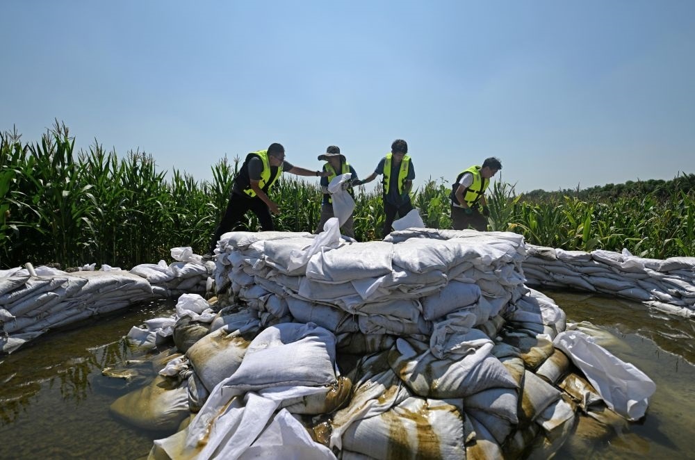 8月3日,在天津市靜海區(qū)臺(tái)頭鎮(zhèn),工人在大清河北堤上參與堤壩加高加固工作。 新華每日電訊記者孫凡越攝