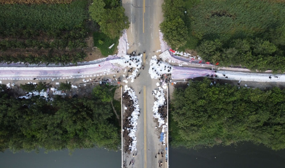 武警第一機(jī)動(dòng)總隊(duì)某支隊(duì)官兵在大清河支渠橋處搶筑堤壩(8月10日攝,無人機(jī)照片)。新華每日電訊記者趙子碩攝