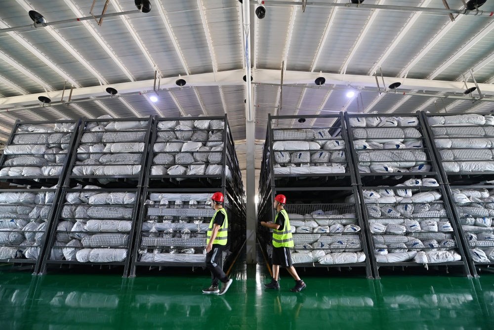 工作人員在天津市救災(zāi)物資儲(chǔ)備站內(nèi)的倉(cāng)庫(kù)巡查(8月16日攝)。新華每日電訊記者李然攝