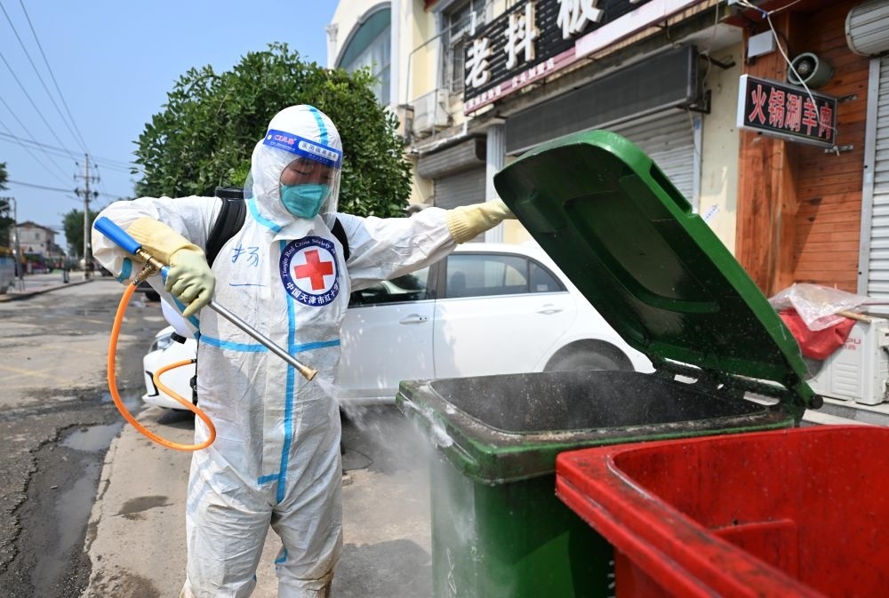 8月17日,工作人員在天津市靜海區(qū)臺(tái)頭鎮(zhèn)進(jìn)行消殺作業(yè)。新華每日電訊記者趙子碩攝