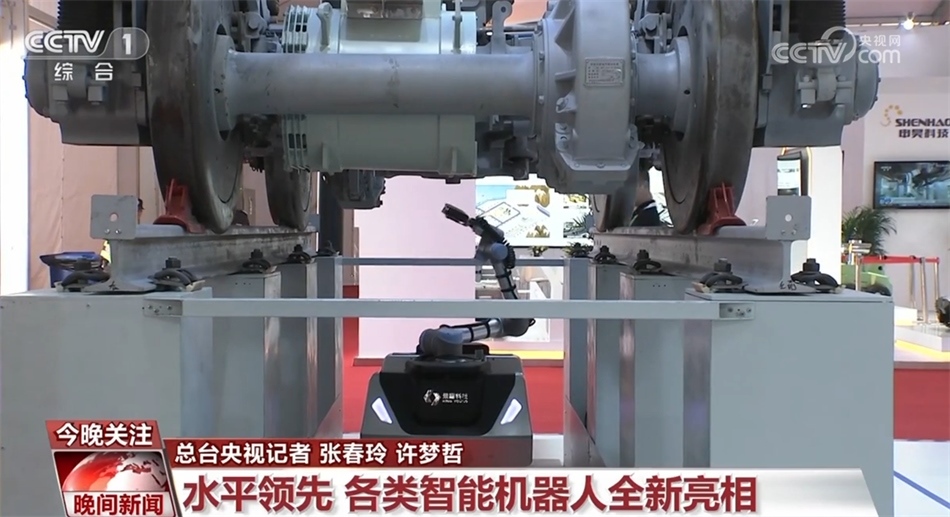 現在您看到的是一款列車智能巡檢機器人,它可以替代成熟的技術工人自主采集車底、車側高清圖像和3D數據,巡檢定位精度達到正負5毫米。