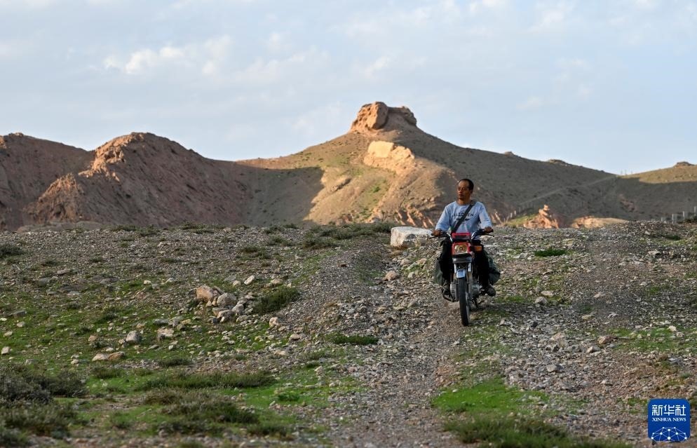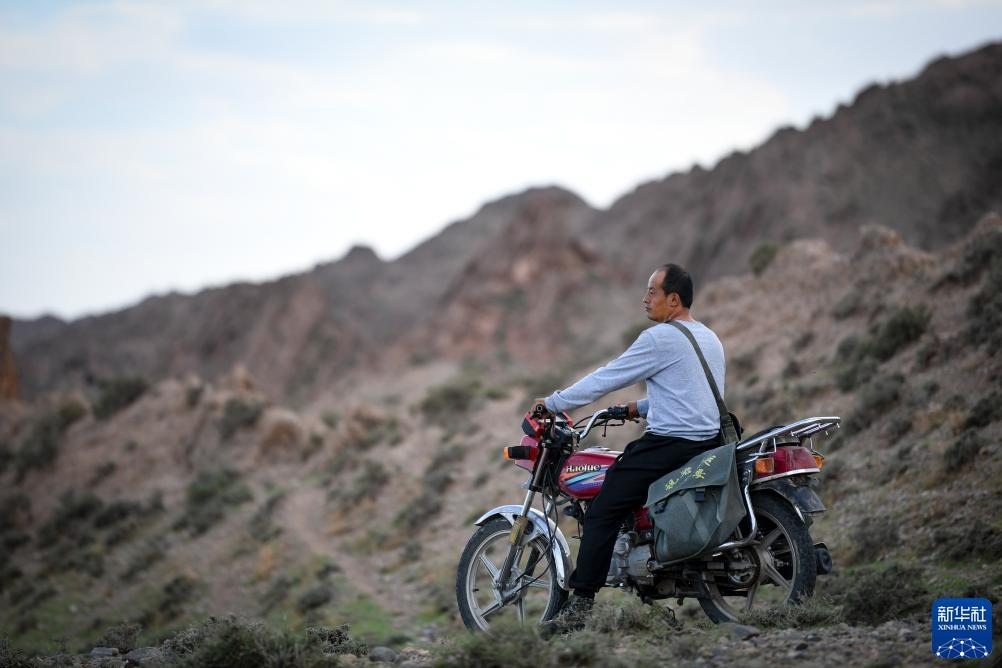 8月20日,董海寧騎摩托車巡查賀蘭山沿線的明長(zhǎng)城永寧段。新華社記者 馮開(kāi)華 攝