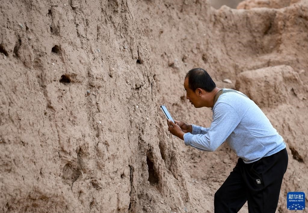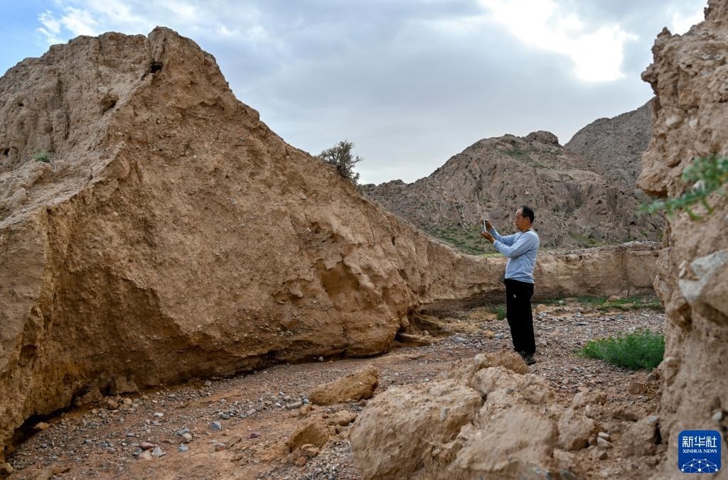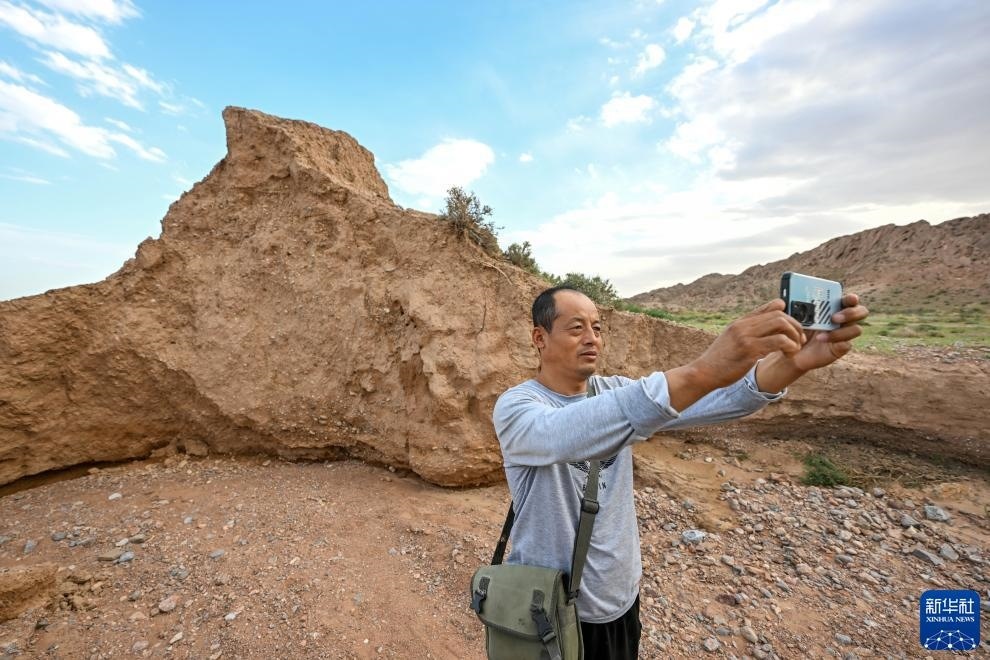 8月20日,董海寧巡查賀蘭山沿線的明長(zhǎng)城永寧段時(shí)用手機(jī)拍照記錄。新華社記者 連振 攝