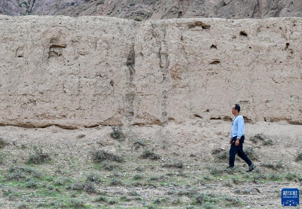8月20日,董海寧觀察長(zhǎng)城墻體情況。新華社記者 劉金海 攝