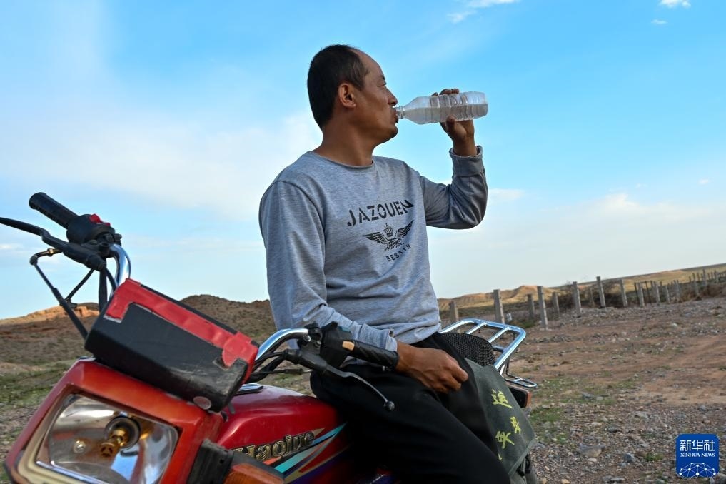 8月20日,董海寧在巡查途中喝水。新華社記者 劉金海 攝