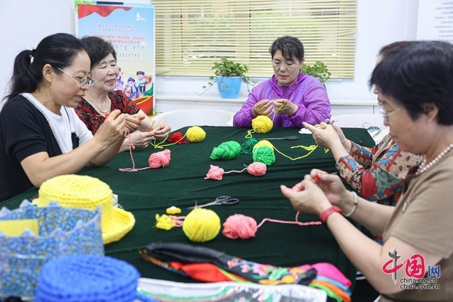 在臨潢家園社區(qū)便民服務(wù)中心內(nèi),各族居民制作手工編織藝術(shù)品。中國網(wǎng)記者 倫曉璇 攝