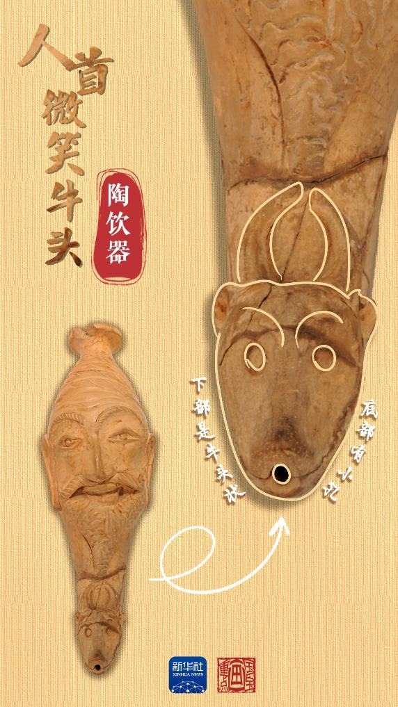 當(dāng)中國(guó)絲綢的美譽(yù)經(jīng)由古絲綢之路在西亞、歐洲等地傳揚(yáng)時(shí),西方文明也穿過風(fēng)沙與長(zhǎng)歌,在中國(guó)留下了印記。人首微笑牛頭陶飲器出土于和田地區(qū)約特干遺址,為唐代時(shí)期文物。飲器上部為人首形,下部是牛頭狀,底部帶小圓孔,上下兩部分內(nèi)腔相通。人首上唇胡須外展卷翹,面帶微笑。牛頭微微上翹,牛角豎立攏圓。這種飲器造型源自“來通”,即末端為動(dòng)物形或人首形的角杯,是小亞細(xì)亞和地中海地區(qū)常見的飲酒器具,絲綢之路沿線國(guó)家都有類似文物出土。
