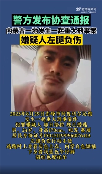 ·內(nèi)蒙古赤峰市發(fā)生一起重大刑事案件,警方發(fā)布協(xié)查通報。