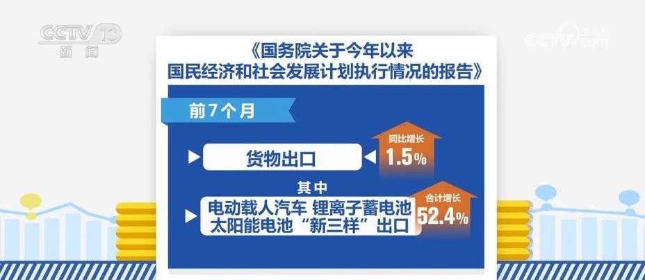 前7個(gè)月,貨物出口同比增長1.5%,其中,電動(dòng)載人汽車、鋰離子蓄電池、太陽能電池“新三樣”出口合計(jì)增長52.4%。