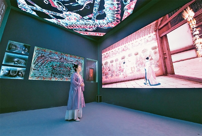 圖為2023年6月8日,一名身著傳統(tǒng)服飾的觀眾在第十九屆中國(深圳)國際文化產(chǎn)業(yè)博覽交易會(huì)甘肅展臺(tái)觀看數(shù)字敦煌展覽。 新華社記者 梁旭/攝