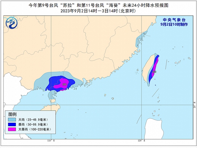 降水預(yù)報(bào):9月2日14時(shí)至3日14時(shí),受“蘇拉”和“??庇绊?,廣東西南部、廣西東南部、福建東北部沿海、臺灣島東部等地有大到暴雨,其中,廣東西南部、臺灣島東部等地部分地區(qū)有大暴雨(100~220毫米)。