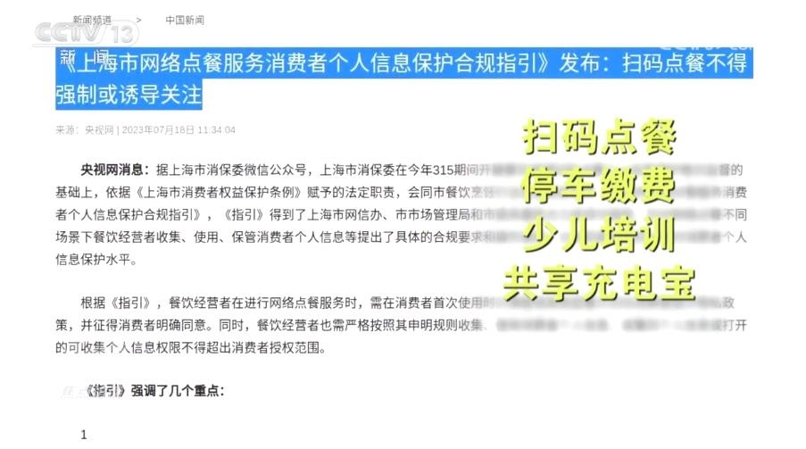 為了加強(qiáng)個人信息保護(hù),上海市消保委自7月起針對掃碼點(diǎn)餐、停車?yán)U費(fèi)、少兒培訓(xùn)和共享充電寶等四種消費(fèi)場景,分別出臺了合規(guī)指引、自律承諾和合規(guī)清單。未來,還將針對房產(chǎn)中介、商超購物等主要消費(fèi)場景作出相應(yīng)指引。