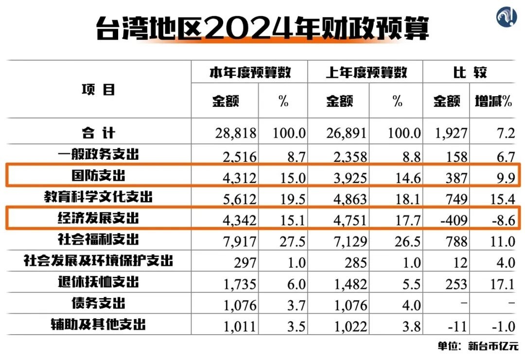 民進(jìn)黨當(dāng)局不久前通過的2024年財(cái)政預(yù)算案就很能說明問題。各項(xiàng)支出中,防務(wù)支出繼續(xù)保持增長(zhǎng),經(jīng)濟(jì)發(fā)展支出卻是所有領(lǐng)域中跌幅最大的。