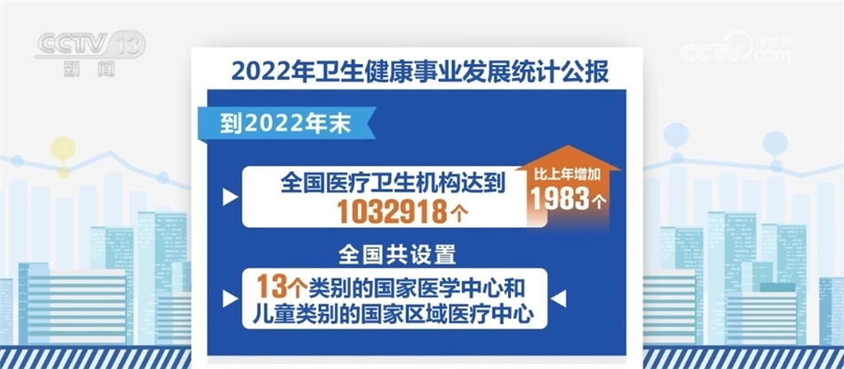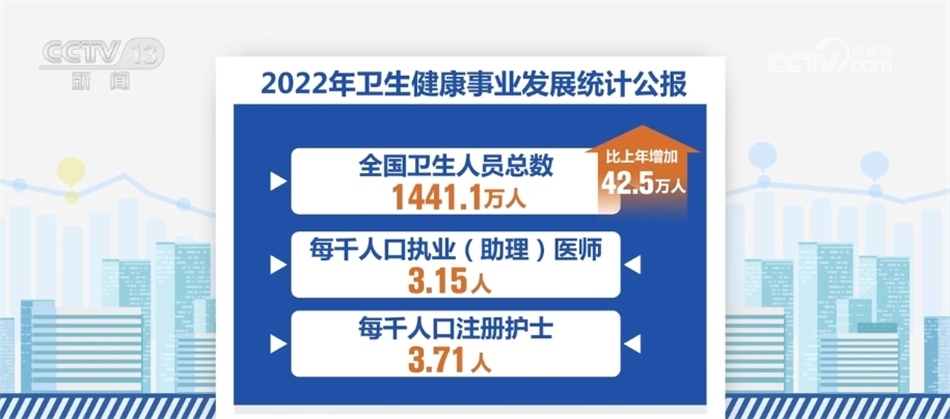 《公報》顯示,我國醫(yī)療衛(wèi)生資源總量繼續(xù)增加。到2022年末,全國醫(yī)療衛(wèi)生機(jī)構(gòu)達(dá)到1032918個,比上年增加1983個。全國共設(shè)置13個類別的國家醫(yī)學(xué)中心和兒童類別的國家區(qū)域醫(yī)療中心。全國醫(yī)療衛(wèi)生機(jī)構(gòu)床位975.0萬張,每千人口醫(yī)療衛(wèi)生機(jī)構(gòu)床位數(shù)由2021年的6.70張增加到2022年的6.92張。全國衛(wèi)生人員總數(shù)1441.1萬人,比上年增加42.5萬人。每千人口執(zhí)業(yè)(助理)醫(yī)師3.15人,每千人口注冊護(hù)士3.71人。